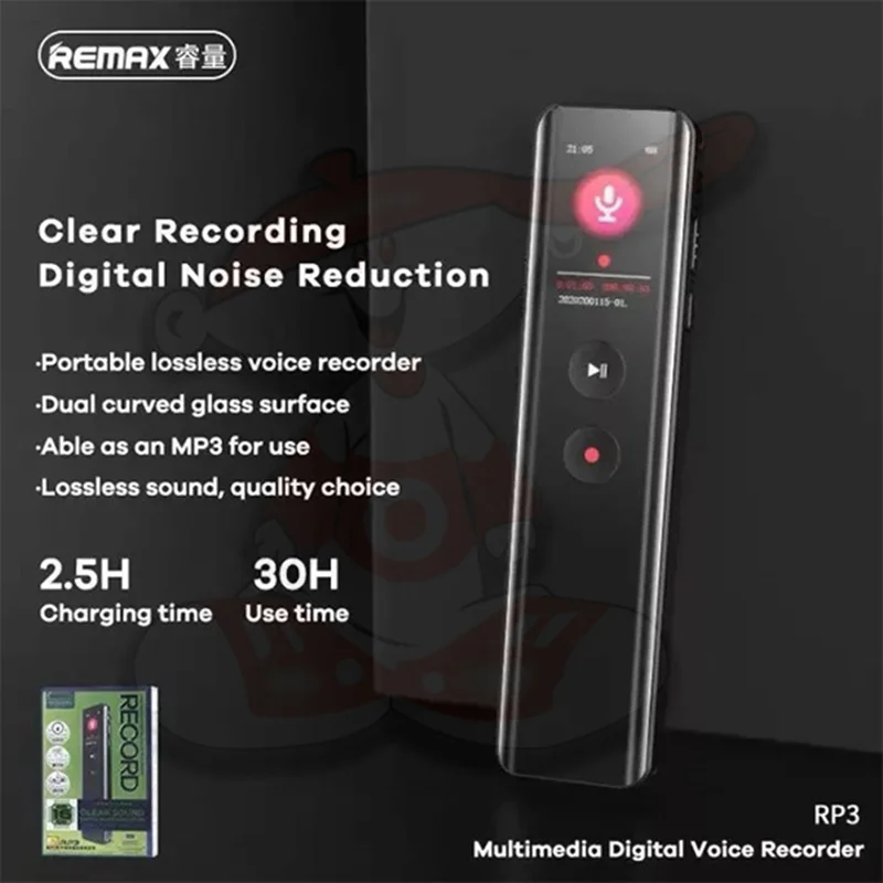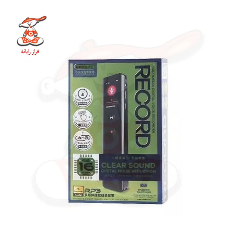 ضبط کننده ریمکس مدل Remax RP3 با ظرفیت حافظه 16 گیگابایت دارای سیستم کاهش نویز فعال و ضبط صدای دیجیتال همراه با پخش کننده موسیقی قابلیت استفاده در کنفرانس مطبوعاتی / جلسات شرکت / کلاس های درسی و آموزشی / مصاحبه/پخش زنده و... می باشد.ضبط کننده ریمکس دارای دو عملکرد فوق العاده ای در ضبط و پخش صدا می باشد. باتری داخلی 360 میلی آمپر ساعتی تا 30 ساعت زمان ضبط مداوم را در اختیار شما قرار می دهد. این ضبط کننده صدای دیجیتال به همراه یک هنسفری ارائه میشود.اندازه کوچک و طراحی جمع و جور به شما امکان می دهد Remax RP3 را همیشه همراه خود داشته باشید. ضبط کننده ریمکس مدل Remax RP3 فقط به 2.5 ساعت برای شارژ کامل نیاز دارد.توانایی اتصال به خط تلفن ثابت داشته و میتوان به ضبط مکالمات تلفنی نیز پرداخت. میکروفون دوگانه و تراشه کاهش نویز در این ضبط صوت دیجیتال از سری Remax RP3 به شما امکان ضبط صدای واضح در جلسات مهم را می دهد و در 2 فرمت MP3 و WAVE ضبط صدا دارد./فرازرایانه