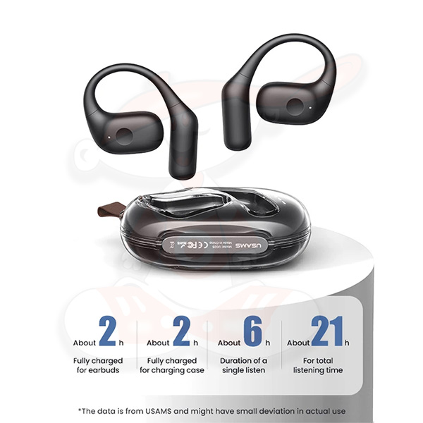 هندزفری حلزونی بلوتوثی یوسمز مدل UG26 یک هندزفری بیسیم زیبا و با کیفیت از برند معتبر USAMS میباشد.طراحی حلزونی شکل و ارگونومیک این هندزفری باعث شده به راحتی در گوش قرار گیرد.جنس بدنه هندزفری بلوتوثی یوسمز از پلاستیک باکیفیت است که بدنه نسبتاً محکمی دارد. طراحی کیس این هندزفری حلزونی به صورت شفاف می باشد که زیبایی آن را چندین برابر کرده است. کیس شارژ آن دارای باتری با ظرفیت 300 میلی آمپر است که میتواند 2 الی 3 بار هندزفری شما را شارژ کند.مدت زمان پخش موسیقی برای این هندزفری حدود 6 ساعت (در صورت قرار دادن صدا به میزان 80 درصد) و مدت مکالمه آن حدود 5 ساعت میباشد. شما میتوانید تا 21 ساعت در صورت استفاده از کیس شارژ آن از این هندزفری استفاده کنید و نیازی به شارژ نداشته باشید. هندزفری usams با توجه به کیفیت خوب صدا و قابلیتهایی مانند صدای استریو و 3D که دارد مناسب برای بازی،موسیقی و مکالمه میباشد.همچنین با توجه به نوع طراحی آن بسیار مناسب استفاده هنگام ورزش کردن است. میکروفون این هندزفری حلزونی بسیار خوب و قدرتمند میباشد که باعث میشود شما یک مکالمه با کیفیت HD داشته باشید.