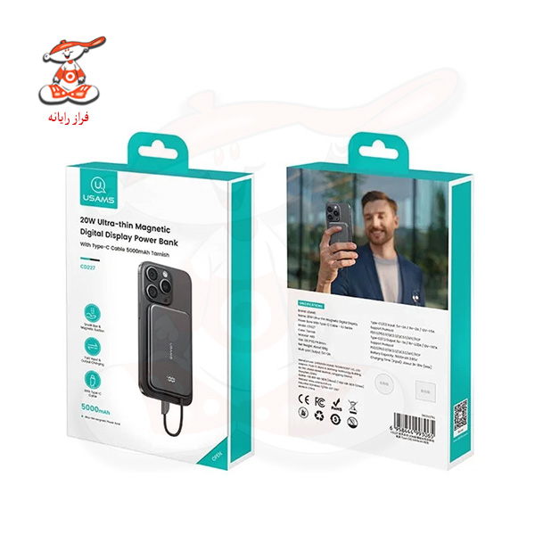 پاوربانک یوسمز مدل US-CD227-20W ظرفیت 5000 میلی آمپر به همراه کابل متصل تایپ سی یکی از سبک ترین و نازک ترین پاوربانک موجود در بازار هست. این پاوربانک فوق العاده نازک و در عین حال سبک با وزن 106 گرم و ابعاد ۶۹.۳*۱۱۲.۱*۸.۸ میلیمتر که به راحتی قابل حمل و جابجایی است و بدون هیچ دغدغه ای می توانید با خود حمل کنید. پاوربانک 5000 یوسمز مدل CD227 دارای یک کابل متصل از نوع Type-C با توان 20 وات هست که قادر به شارژ اکثر گوشی های موجود در بازار هست و همچنین می توان از آن به عنوان یک بندآویز جهت حمل و استفاده راحت تر استفاده کرد.وجود این کابل متصل باعث عدم نیاز شما به حمل کابلهای جداگانه می شود. این پاوربانک قدرتمند و فوق نازک دارای یک ورودی و خروجی از نوع Type-C هم هست که توان ورودی برای شارژ پاوربانک 20 وات و ماکزیمم توان خروجی برای شارژ گوشی 20 وات است. این پاوربانک قدرتمند دارای یک ویژگی مهم دیگر نیز هست و آن قابلیت مغناطیسی و آهنربایی این محصول هست. ( توجه داشته باشید این پاوربانک فاقد شارژ وایرلس هست و از شارژ بی سیم پشتیبانی نمی کند). این ویژگی باعث استفاده راحت و شارژ راحت تر برای شما خواهد بود.