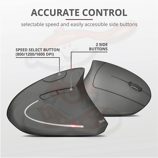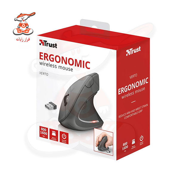 ماوس بی سیم TRUST مدل Verto به لطف طراحی ارگونومیک و استراحت انگشت شست راحت، میتوانید ساعتها در دفتر یا خانه بدون زحمت کار یا مطالعه کنید. و طرح عمودی ساعد و مچ شما را به حالت طبیعی می رساند و به عضلات دست، مچ و بازو استراحت می دهد. روکش لاستیکی این ماوس تضمین می کند که هنگام کار برای مدت طولانی تری در دست نگه دارید. به کمک TRUST راحتی یک ماوس بی سیم را تجربه کنید و میز خود را مرتب نگه دارید. گیرنده این ماوس تضمین می کند که ماوس به صورت بی سیم در محدوده 10 متری کار می کند. همچنین، این ماوس دارای کلید روشن و خاموش است، بنابراین می توانید با خاموش کردن ماوس در زمان عدم استفاده، در مصرف انرژی صرفه جویی کنید. و همچنین به سادگی گیرنده micro USB را به یک پورت USB وصل کنید و می توانید از یک سنسور نوری 800/1200/1600 dpi استفاده کنید که عملکرد دقیق را تضمین می کند. با دکمه ویژه به dpi دیگری بروید یا با دو دکمه انگشت شست به سرعت صفحات وب دیگر را مرور کنید.